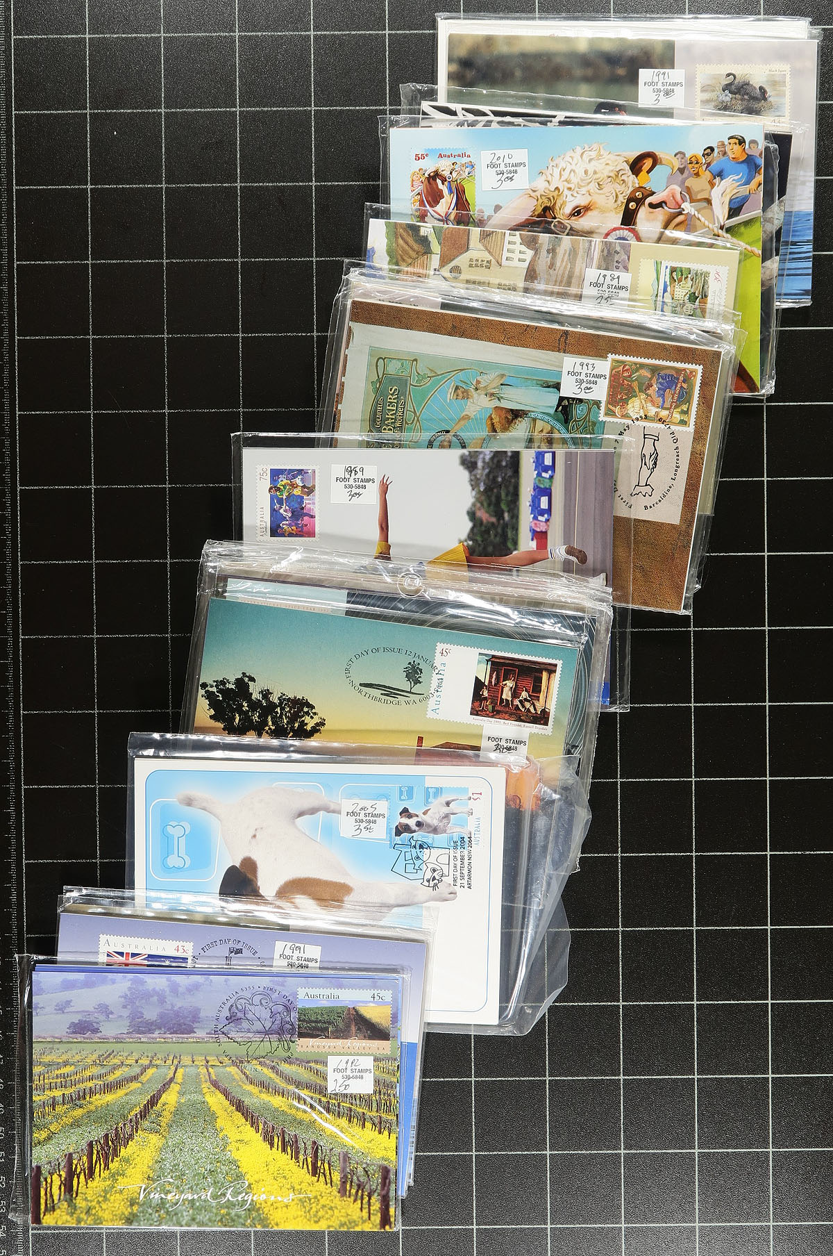 Collection of roughly 1,300 Australia maximum cards, 1990-2012, all with matching stamps tied by first day cancels. Most are still in the original cello-packs, and huge retail price at roughly $2,000. A nice clean lot, ideal for topical and thematic collectors. Estimate =