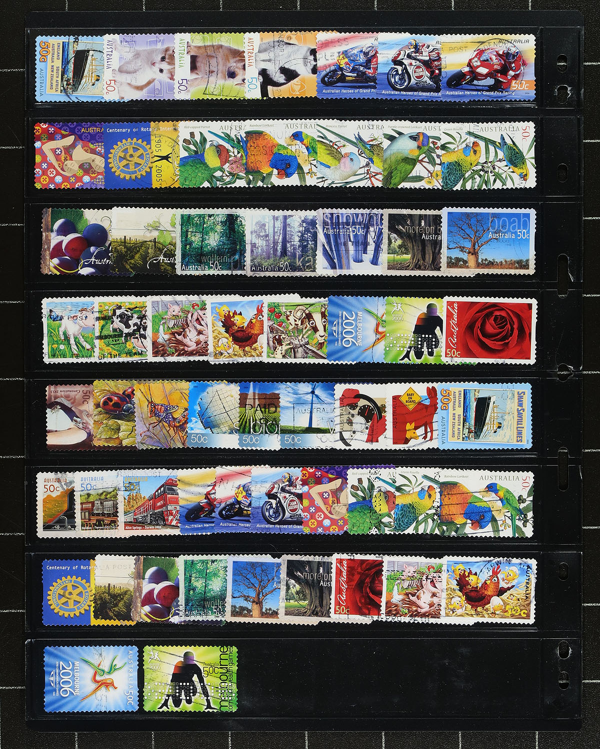 Accumulation of used Australia, 1913-2011, containing a few thousand stamps in roughly 33 stock pages. A quick check of material indicated a bit of everything including selections of Kangaroos, King George V Heads, sets, back of the book material noting postage dues, officials, airmails, and perfins. We spotted a few items cataloguing in the $10 range and up, leaving better finds to the dedicated collector. Owner's 2012 Scott catalogue value for the lot totals US$2,374.00, with duplication up to 10 for some issues. Ideal for the Australia or worldwide collector, with online photos showing a few sample pages. Estimate =