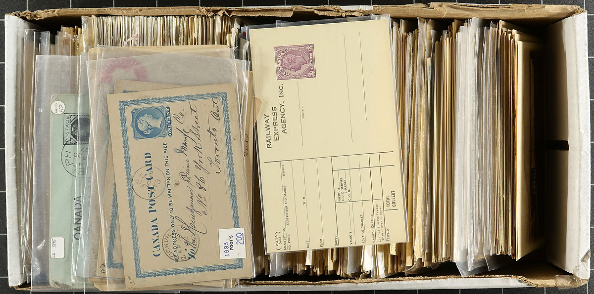 Postal Stationery. Group of roughly 500 mint and used Canada postal stationery items in a long box, 1880's-1980's, with a wide range of material including post cards, envelopes, air letters, letter cards, reply cards, and more. The lot appears to have an even mix of mint and used items, with most of the Victorian used items having Ontario town postmarks (cds, duplex, and a few flag cancels). Many of the items have retail pricing in pencil with some in the $3 to $5 range and up. A nice lot for the stationery collectors, overall fine to very fine. Estimate =
