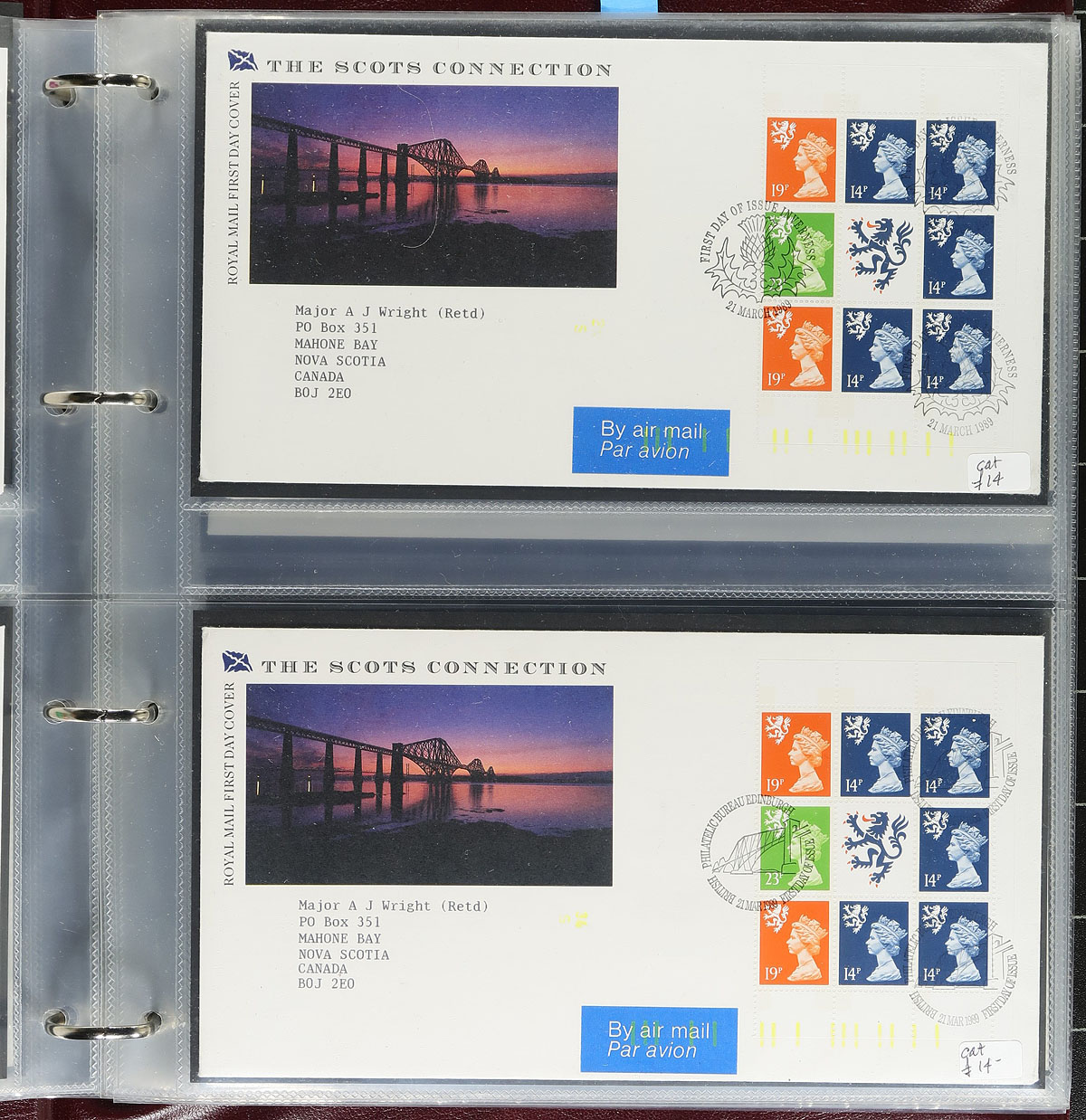 Collection of roughly 300 Great Britain first day covers in 4 Royal Mail First Day Cover albums, 1980's-2010. This lovely collection contains singles, sets, booklet panes, and souvenir sheet frankings, and includes roughly 80 high value Machin FDC's, and 80 Regional issues. Many of the covers have catalogue values provided by the owner, many ranging in the £5 to £15 range, with a total for the collection at £1,953.00. A nice grouping for collector and dealers alike. Estimate =