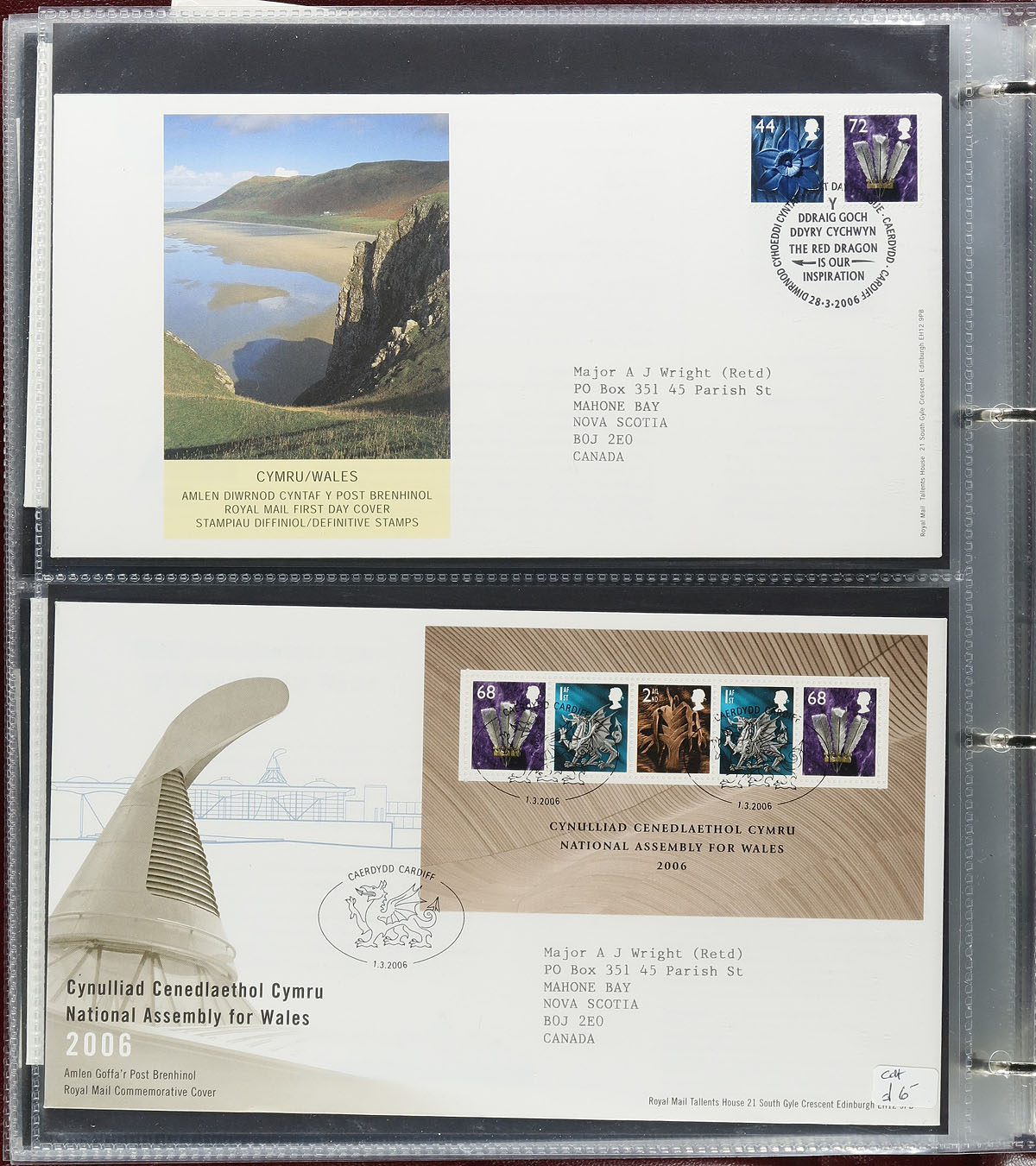 Collection of roughly 300 Great Britain first day covers in 4 Royal Mail First Day Cover albums, 1980's-2010. This lovely collection contains singles, sets, booklet panes, and souvenir sheet frankings, and includes roughly 80 high value Machin FDC's, and 80 Regional issues. Many of the covers have catalogue values provided by the owner, many ranging in the £5 to £15 range, with a total for the collection at £1,953.00. A nice grouping for collector and dealers alike. Estimate =