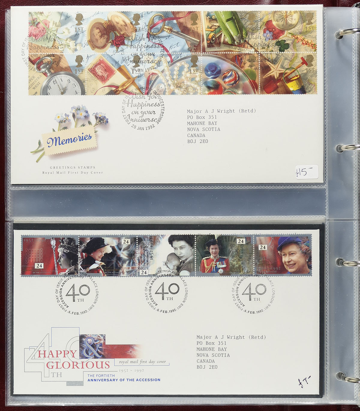 Collection of roughly 300 Great Britain first day covers in 4 Royal Mail First Day Cover albums, 1980's-2010. This lovely collection contains singles, sets, booklet panes, and souvenir sheet frankings, and includes roughly 80 high value Machin FDC's, and 80 Regional issues. Many of the covers have catalogue values provided by the owner, many ranging in the £5 to £15 range, with a total for the collection at £1,953.00. A nice grouping for collector and dealers alike. Estimate =