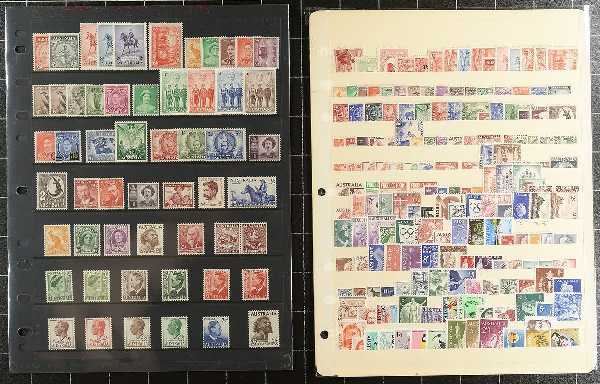 Collection / accumulation of mint Australia, 1920's-1990's, containing roughly 1,300 stamps in roughly 19 stock pages. The collection generally ranged from Scott #147/1488, including many sets, and a few souvenir sheets and booklets. A cursory check of catalogue values indicated some singles and sets cataloguing $10 and up. Owner's 2017 catalogue value for the lot totals US$1,695.00. The lot is a mixture of hinged and never hinged material (mostly post-1970s), with duplication up to 5 for some issues. Face value alone would be several hundred dollars. Estimate =
