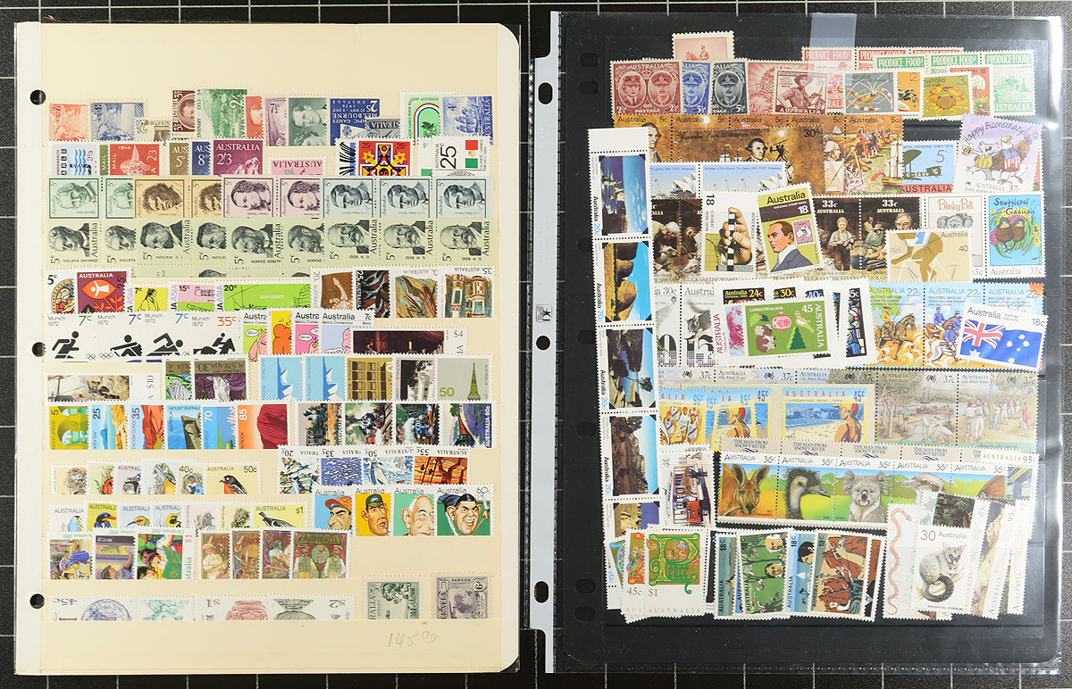 Collection / accumulation of mint Australia, 1920's-1990's, containing roughly 1,300 stamps in roughly 19 stock pages. The collection generally ranged from Scott #147/1488, including many sets, and a few souvenir sheets and booklets. A cursory check of catalogue values indicated some singles and sets cataloguing $10 and up. Owner's 2017 catalogue value for the lot totals US$1,695.00. The lot is a mixture of hinged and never hinged material (mostly post-1970s), with duplication up to 5 for some issues. Face value alone would be several hundred dollars. Estimate =