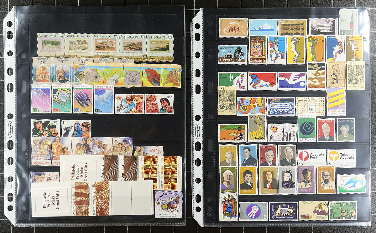 Collection / accumulation of mint Australia, 1920's-1990's, containing roughly 1,300 stamps in roughly 19 stock pages. The collection generally ranged from Scott #147/1488, including many sets, and a few souvenir sheets and booklets. A cursory check of catalogue values indicated some singles and sets cataloguing $10 and up. Owner's 2017 catalogue value for the lot totals US$1,695.00. The lot is a mixture of hinged and never hinged material (mostly post-1970s), with duplication up to 5 for some issues. Face value alone would be several hundred dollars. Estimate =