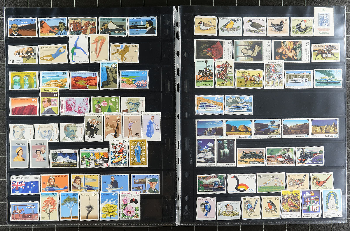 Collection / accumulation of mint Australia, 1920's-1990's, containing roughly 1,300 stamps in roughly 19 stock pages. The collection generally ranged from Scott #147/1488, including many sets, and a few souvenir sheets and booklets. A cursory check of catalogue values indicated some singles and sets cataloguing $10 and up. Owner's 2017 catalogue value for the lot totals US$1,695.00. The lot is a mixture of hinged and never hinged material (mostly post-1970s), with duplication up to 5 for some issues. Face value alone would be several hundred dollars. Estimate =