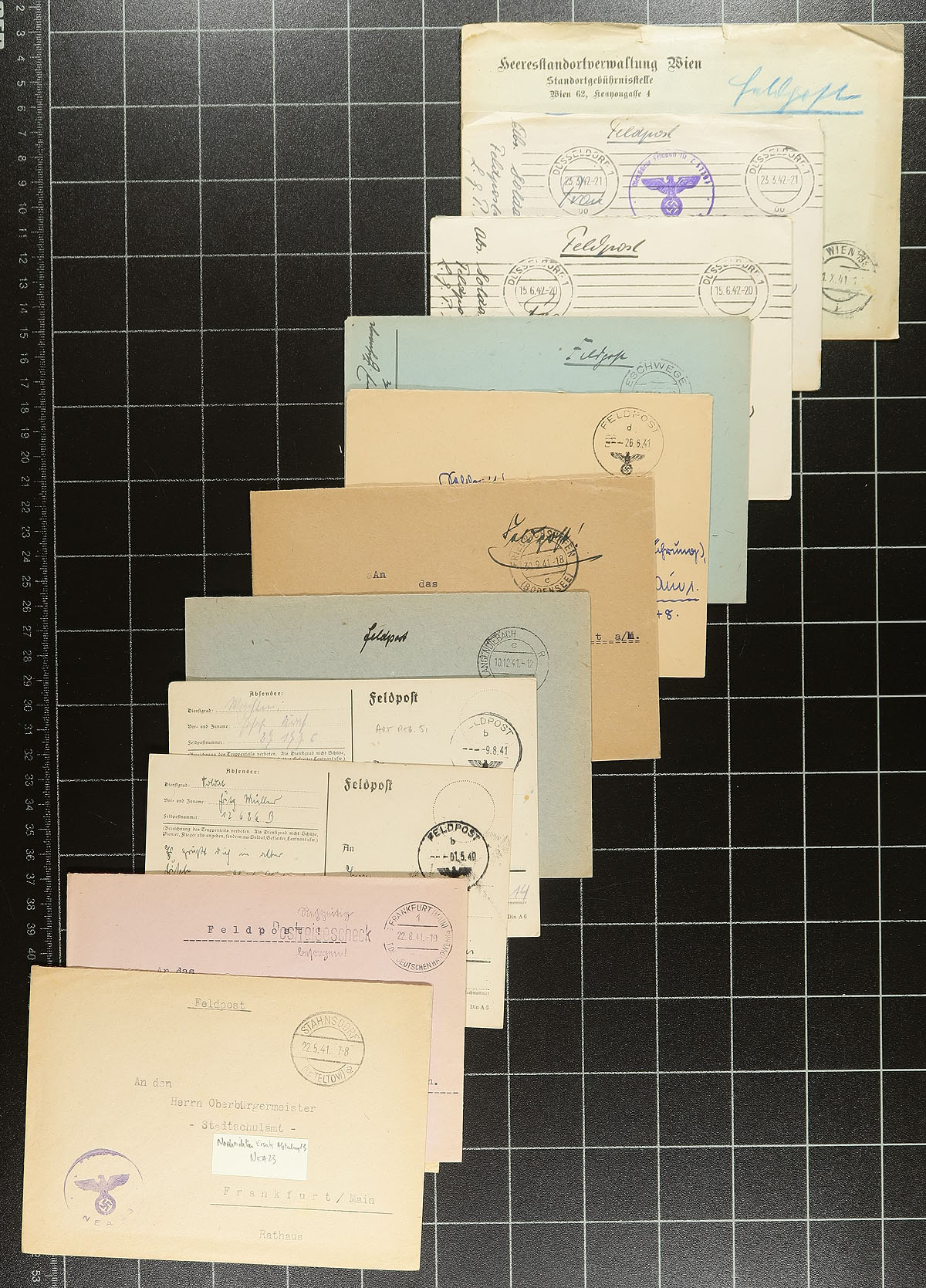 Group of roughly 90 interesting Germany military related items in a small box. The lot includes a wide variety of items including covers (including some having letter enclosures), postcards, and postal stationery, noting a great variety of postmarks and handstamps including Waffen SS, Hitler Youth, navy and airforce units, military court mail, along with mail from scarce or unusual units, Feldpost postmark varieties, and much more. A better than average grouping, overall fine to very fine. Estimate =