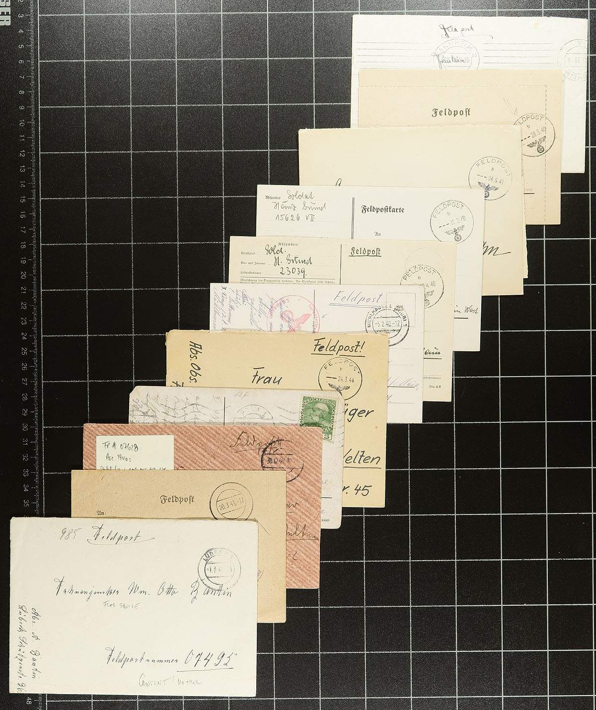 Group of roughly 90 interesting Germany military related items in a small box. The lot includes a wide variety of items including covers (including some having letter enclosures), postcards, and postal stationery, noting a great variety of postmarks and handstamps including Waffen SS, Hitler Youth, navy and airforce units, military court mail, along with mail from scarce or unusual units, Feldpost postmark varieties, and much more. A better than average grouping, overall fine to very fine. Estimate =
