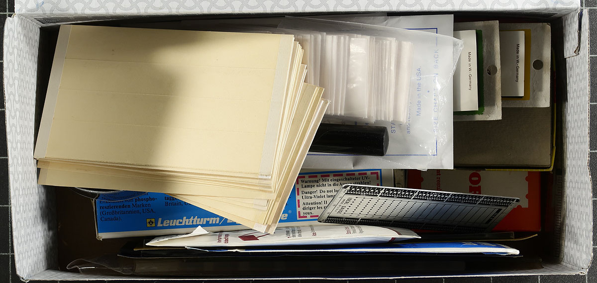 Bankers Box Balance. A useful group of "odds and ends", being the balance of the supplies offered in this sale. This lot includes A brand-new "Master Global Stamp Album" by Minkus (circa 1980 covering the world A-Z), two red "102" dealer boxes, quadrille pages, 3-hole punch, two Canada Post stamp paper-weights (1990's P.O. product), mount cutter, perf gauge, a few partial packs of mounts, watermark tray, dealer cards and two "Bank Vault" stockbooks. A very useful group. Estimate =