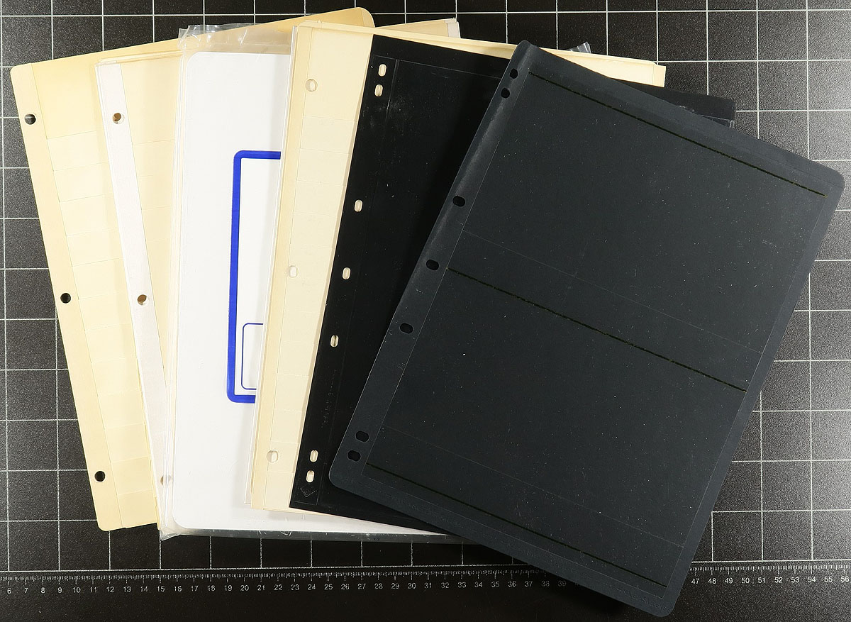 Bankers Box Balance. A useful group of "odds and ends", being the balance of the supplies offered in this sale. This lot includes A brand-new "Master Global Stamp Album" by Minkus (circa 1980 covering the world A-Z), two red "102" dealer boxes, quadrille pages, 3-hole punch, two Canada Post stamp paper-weights (1990's P.O. product), mount cutter, perf gauge, a few partial packs of mounts, watermark tray, dealer cards and two "Bank Vault" stockbooks. A very useful group. Estimate =