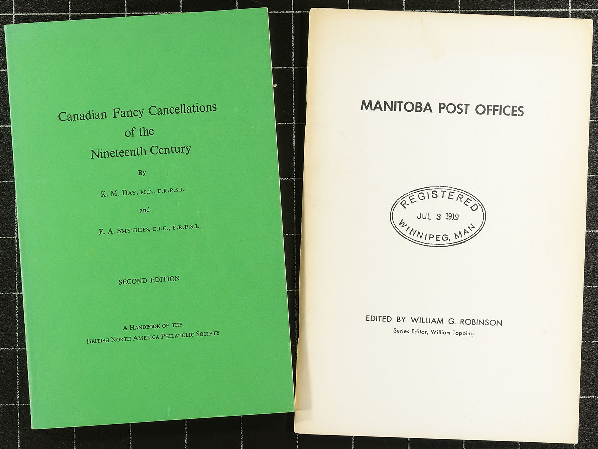 Postal History Themed Philatelic Literature. A "wine box" array of over 20 books / handbooks with a Postal History theme, sure to bolster any philatelic library. Titles include "Stamping Around" (Jarrett book), "10 Auction" (Eaton Auction), several books on Western Canadian Postal History (including P.O. checklists), Airmail and Military related. Take a good look at the pictures, as all are imaged to give a full scope of the lot. Condition is fair to good on all, used as these came from an active collector's "working" library. Estimate =