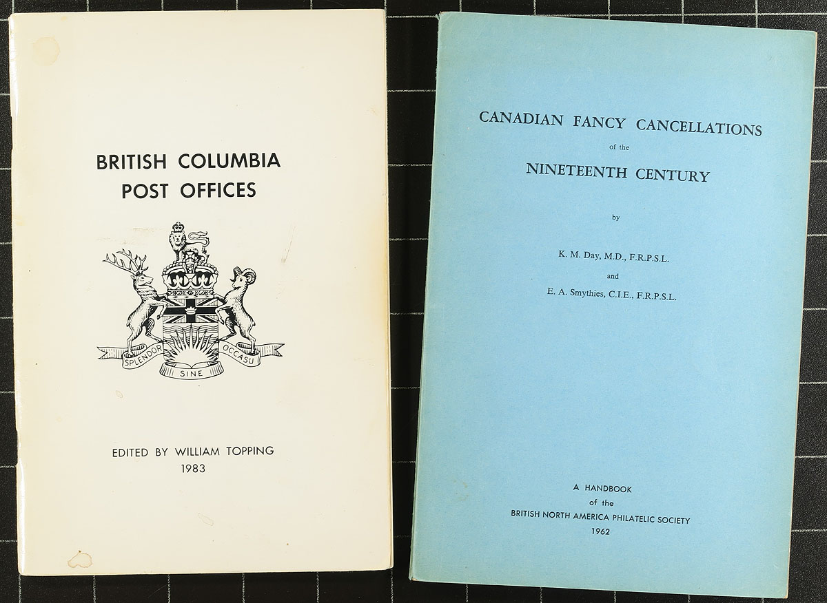 Postal History Themed Philatelic Literature. A "wine box" array of over 20 books / handbooks with a Postal History theme, sure to bolster any philatelic library. Titles include "Stamping Around" (Jarrett book), "10 Auction" (Eaton Auction), several books on Western Canadian Postal History (including P.O. checklists), Airmail and Military related. Take a good look at the pictures, as all are imaged to give a full scope of the lot. Condition is fair to good on all, used as these came from an active collector's "working" library. Estimate =