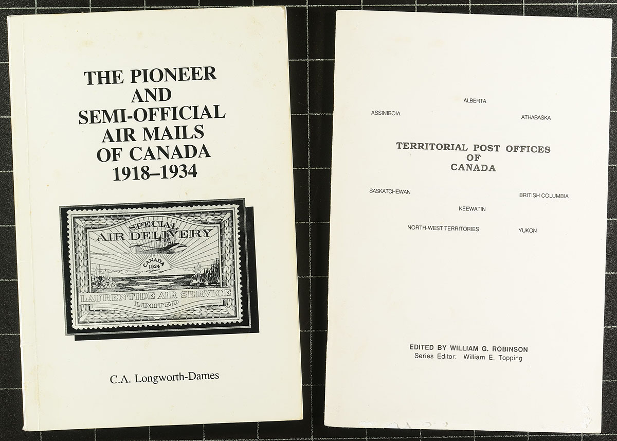 Postal History Themed Philatelic Literature. A "wine box" array of over 20 books / handbooks with a Postal History theme, sure to bolster any philatelic library. Titles include "Stamping Around" (Jarrett book), "10 Auction" (Eaton Auction), several books on Western Canadian Postal History (including P.O. checklists), Airmail and Military related. Take a good look at the pictures, as all are imaged to give a full scope of the lot. Condition is fair to good on all, used as these came from an active collector's "working" library. Estimate =