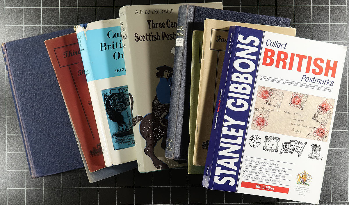 Old-time "Postmark" Literature for England / Scotland / Ireland, with a "modern" addition. An old time holding of books / handbooks dating from 1940-1971 (9 in total), plus a more modern 9th Edition "Collect British Postmarks" (2013, published by Stanley Gibbons). Fair condition overall, an interesting holding. Estimate =