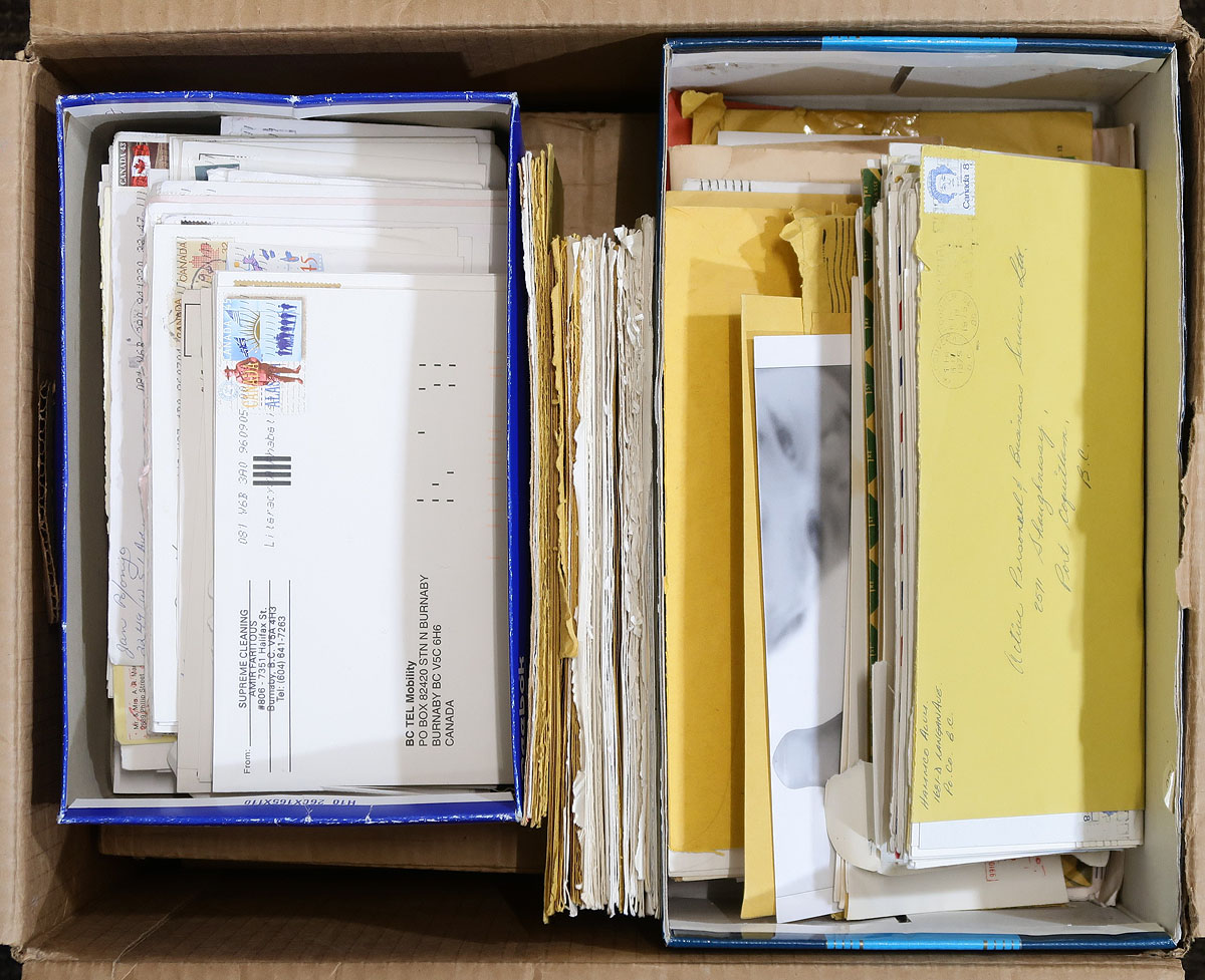 Official Mail Balance of Consignment. A two U-Haul box balance of a cover consignment including the large OHMS/Free holding that is for sale in this auction. Includes four stationery boxes filled with about 1500 #10 federal government envelopes with printed or metered indication that postage is prepaid. There is also a small postal stationery holding of 1920's-1950's "water" cards. There is a large flyspeck collection of #593, the 8c QEII "Caricature" issue, with a mounted collection and a couple of boxes of covers with many different minor print variations noted. The boxes are rounded out with handfuls of loose Canadian covers, ranging from "more government mail" to envelopes from personal correspondence. Thousands of items here. Estimate =