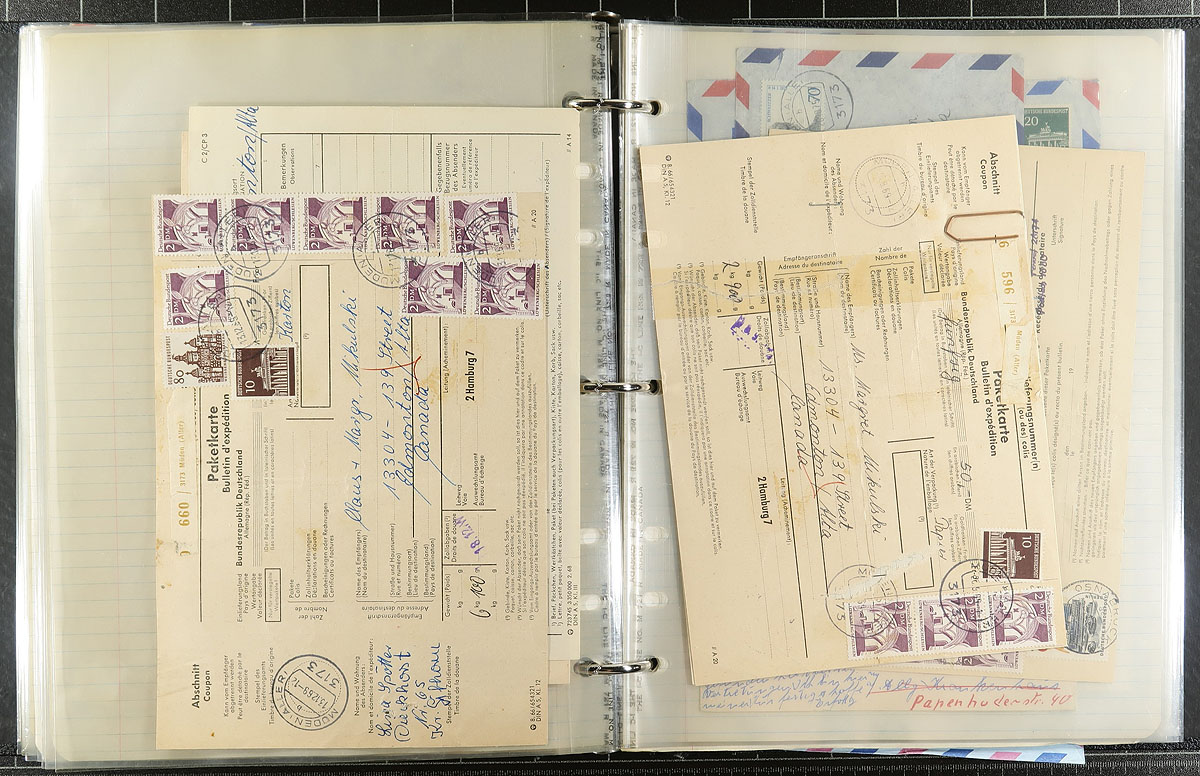 Selection of "Buildings" "Brandenburg Gate" and "Safety" definitive issues on covers with a wide assortment of rates and usages, filling a large three ring binder. A mix of personal and commercial mail sent to Canada between 1967-1972. Lots of "plus" rated services such as airmail and registered rates, with a few large parcel cards. A number of larger parcel pieces are not included in the item count of 178 covers in total. Estimate =