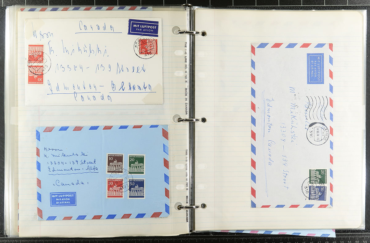 Selection of "Buildings" "Brandenburg Gate" and "Safety" definitive issues on covers with a wide assortment of rates and usages, filling a large three ring binder. A mix of personal and commercial mail sent to Canada between 1967-1972. Lots of "plus" rated services such as airmail and registered rates, with a few large parcel cards. A number of larger parcel pieces are not included in the item count of 178 covers in total. Estimate =