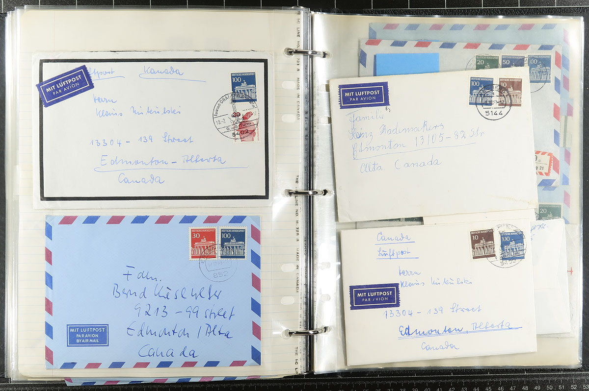 Selection of "Buildings" "Brandenburg Gate" and "Safety" definitive issues on covers with a wide assortment of rates and usages, filling a large three ring binder. A mix of personal and commercial mail sent to Canada between 1967-1972. Lots of "plus" rated services such as airmail and registered rates, with a few large parcel cards. A number of larger parcel pieces are not included in the item count of 178 covers in total. Estimate =