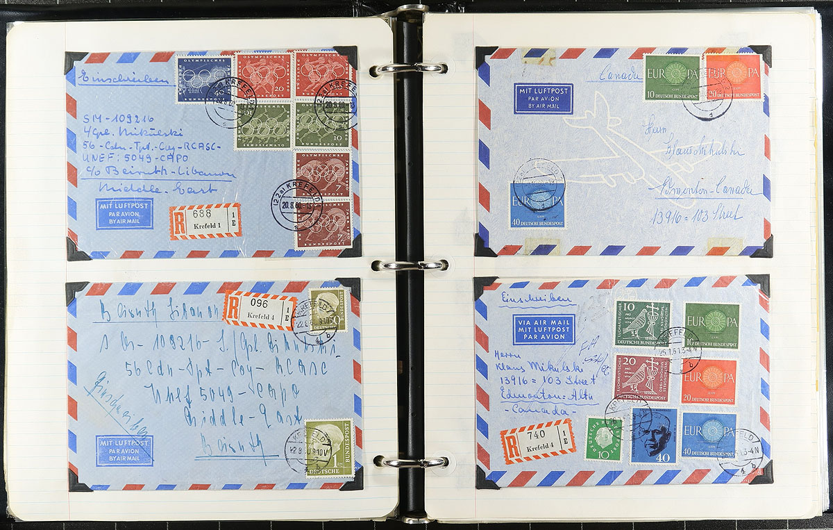 Post-War holding of personal and philatelic covers filling a large three-ring binder. Most sent to Canada 1956-1960 and many are philatelically inspired with a nice selection of stamps that have been cleanly cancelled. Lots of "plus" rated services such as airmail, special delivery and registered rates, which will make for interesting rate studies. A total of 160 covers. Estimate =