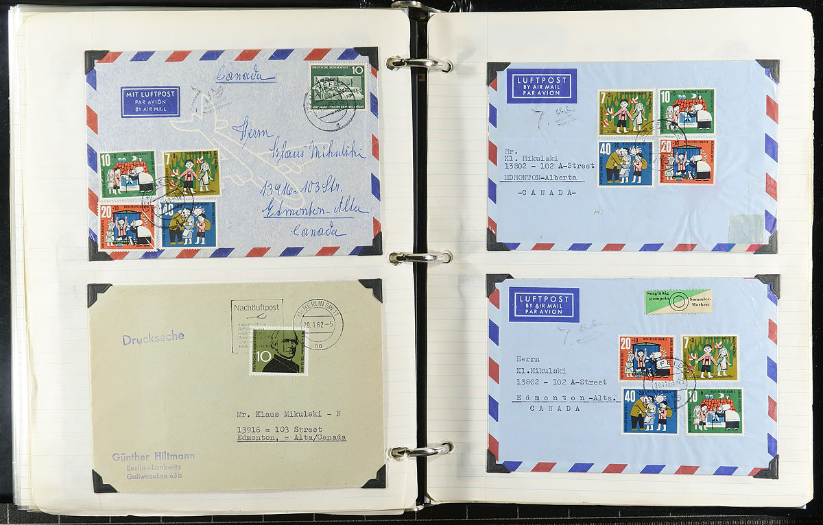 Post-War holding of personal and philatelic covers filling a large three-ring binder. Most sent to Canada 1956-1960 and many are philatelically inspired with a nice selection of stamps that have been cleanly cancelled. Lots of "plus" rated services such as airmail, special delivery and registered rates, which will make for interesting rate studies. A total of 160 covers. Estimate =