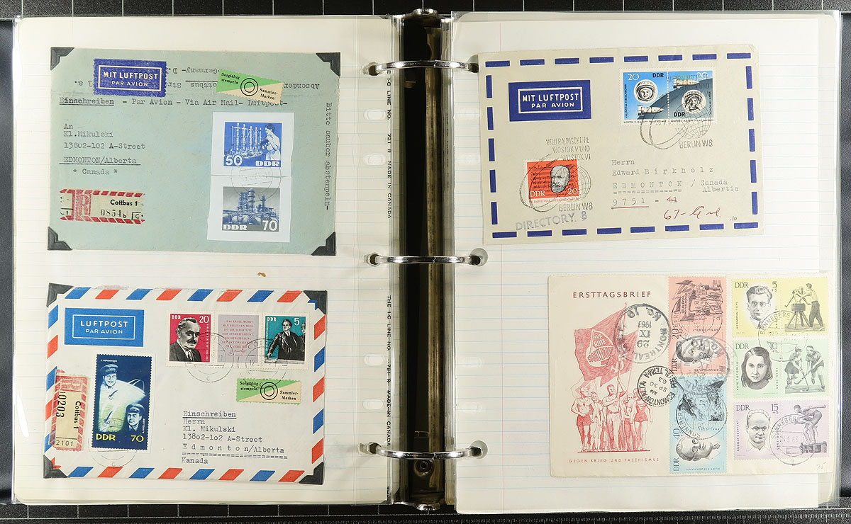 Democratic Republic cover accumulation in a three-ring binder, covering 1961-1967. A mix of sets and singles including some back of the book with lots of rate potential. A total of 146 covers, mostly sent to Canada. Includes first day or commemorative covers, with lots of "plus" rated services such as airmail, special delivery and registered rates. Mostly hand cancelled, with a bit of duplication. Estimate =