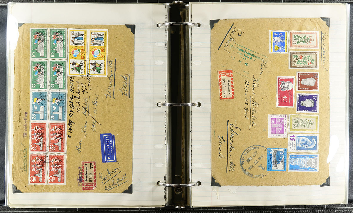 Democratic Republic cover accumulation in a three-ring binder, covering 1961-1967. A mix of sets and singles including some back of the book with lots of rate potential. A total of 146 covers, mostly sent to Canada. Includes first day or commemorative covers, with lots of "plus" rated services such as airmail, special delivery and registered rates. Mostly hand cancelled, with a bit of duplication. Estimate =
