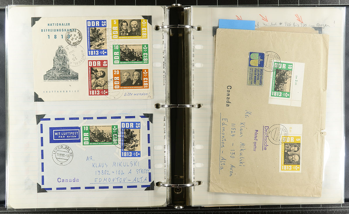 Democratic Republic cover accumulation in a three-ring binder, covering 1961-1967. A mix of sets and singles including some back of the book with lots of rate potential. A total of 146 covers, mostly sent to Canada. Includes first day or commemorative covers, with lots of "plus" rated services such as airmail, special delivery and registered rates. Mostly hand cancelled, with a bit of duplication. Estimate =