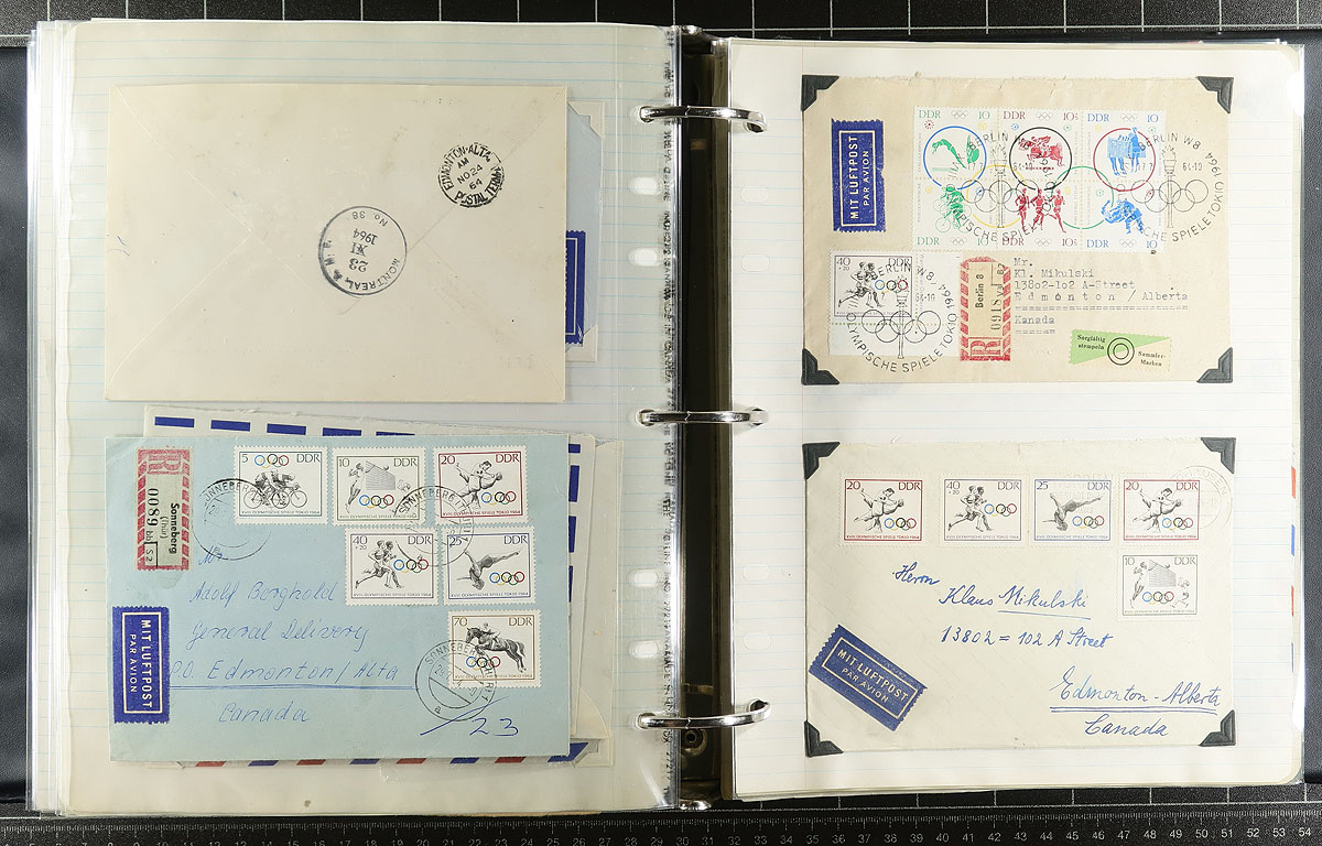 Democratic Republic cover accumulation in a three-ring binder, covering 1961-1967. A mix of sets and singles including some back of the book with lots of rate potential. A total of 146 covers, mostly sent to Canada. Includes first day or commemorative covers, with lots of "plus" rated services such as airmail, special delivery and registered rates. Mostly hand cancelled, with a bit of duplication. Estimate =