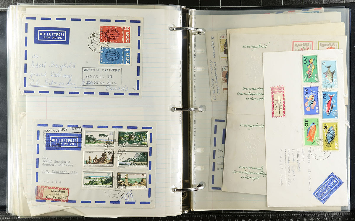 Democratic Republic cover accumulation in a three-ring binder, covering 1961-1967. A mix of sets and singles including some back of the book with lots of rate potential. A total of 146 covers, mostly sent to Canada. Includes first day or commemorative covers, with lots of "plus" rated services such as airmail, special delivery and registered rates. Mostly hand cancelled, with a bit of duplication. Estimate =