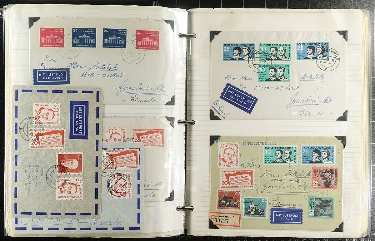 Democratic Republic cover accumulation in a three-ring binder, covering 1959-1962. A mix of sets and singles including some back of the book with lots of rate potential. A total of 129 covers, mostly sent to Canada. Includes first day or commemorative covers, with lots of "plus" rated services such as airmail, special delivery and registered rates. Mostly hand cancelled, with a bit of duplication. Estimate =