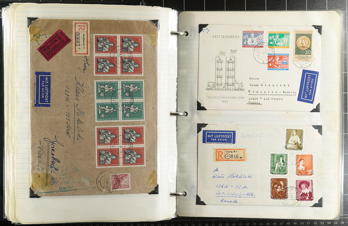 Democratic Republic cover accumulation in a three-ring binder, covering 1959-1962. A mix of sets and singles including some back of the book with lots of rate potential. A total of 129 covers, mostly sent to Canada. Includes first day or commemorative covers, with lots of "plus" rated services such as airmail, special delivery and registered rates. Mostly hand cancelled, with a bit of duplication. Estimate =