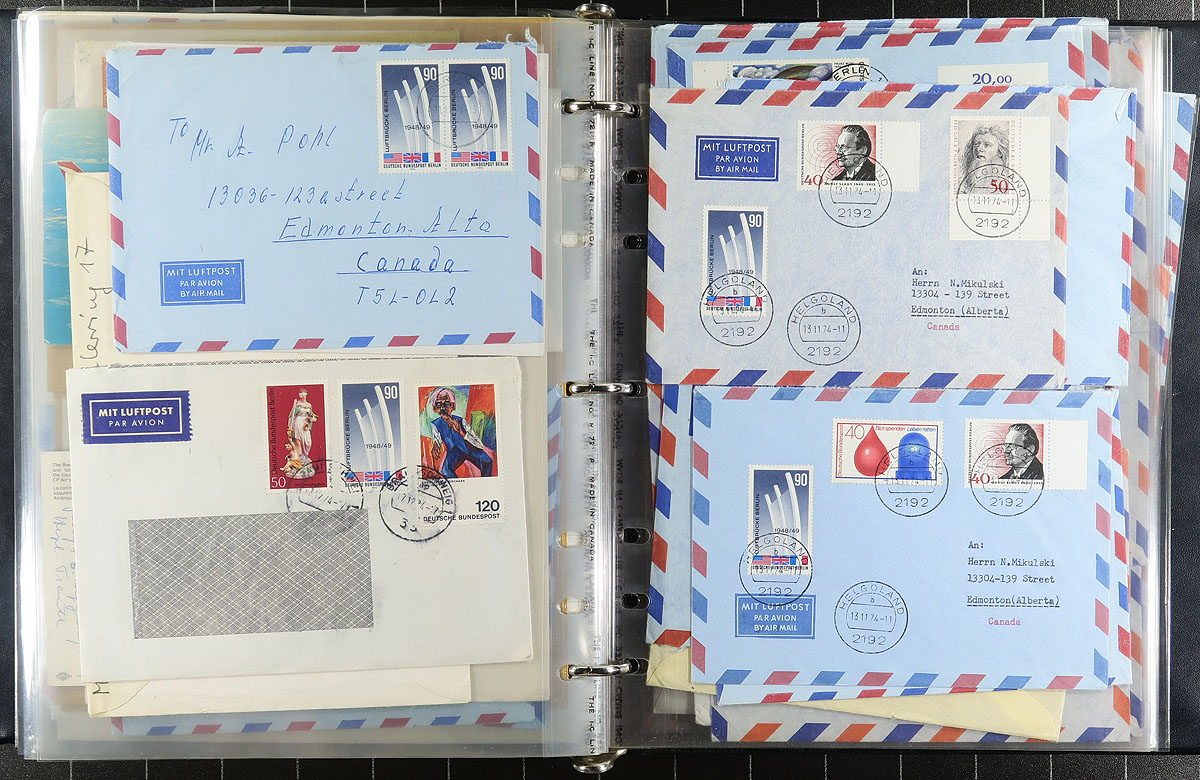 Cover accumulation housed in a three-ring binder, covering 1970-1976. A mix of sets and singles including some semi-postals with lots of rate potential. A total of 180 covers, mostly sent to Canada. Includes first day (sometimes with different cachets) or commemorative covers, with lots of "plus" rated services such as airmail and registered rates. Mostly hand cancelled, with a bit of duplication. Estimate =