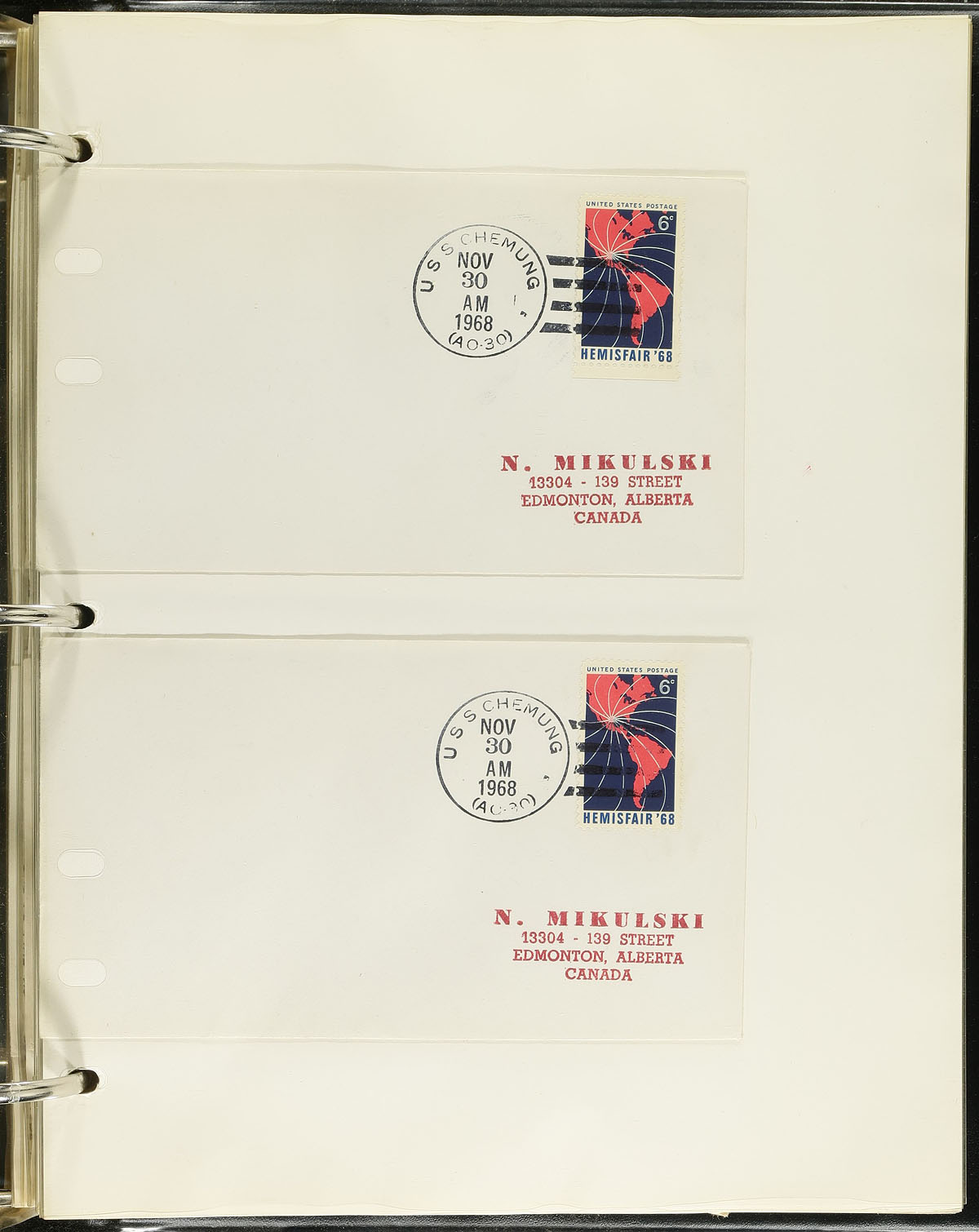 Four volume naval post office cancels on cover, mounted on pages and in page protectors. Created by a collector in Edmonton in 1968, who wrote every US naval ship that he thought might have a post office and created self-addressed envelopes. The return rate was quite high, and these covers have a combination of ship name, number and sometimes a rubber stamp or embossed cachet. Total of about 754 covers, most with two examples per ship (so over 350 different ships are here). A labour of love, with significant effort to assemble this. Estimate =