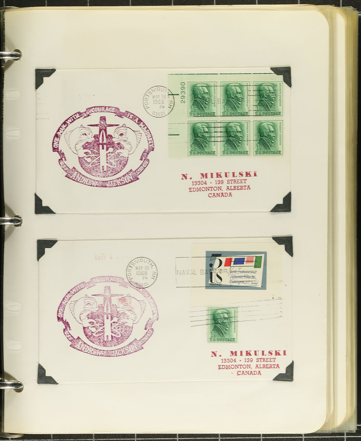 Four volume naval post office cancels on cover, mounted on pages and in page protectors. Created by a collector in Edmonton in 1968, who wrote every US naval ship that he thought might have a post office and created self-addressed envelopes. The return rate was quite high, and these covers have a combination of ship name, number and sometimes a rubber stamp or embossed cachet. Total of about 754 covers, most with two examples per ship (so over 350 different ships are here). A labour of love, with significant effort to assemble this. Estimate =