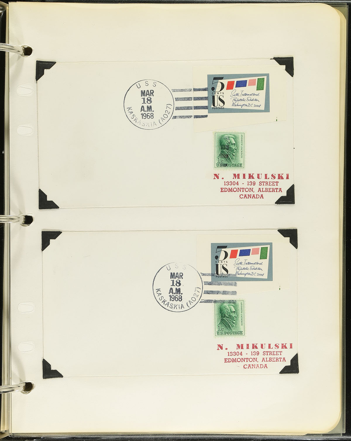 Four volume naval post office cancels on cover, mounted on pages and in page protectors. Created by a collector in Edmonton in 1968, who wrote every US naval ship that he thought might have a post office and created self-addressed envelopes. The return rate was quite high, and these covers have a combination of ship name, number and sometimes a rubber stamp or embossed cachet. Total of about 754 covers, most with two examples per ship (so over 350 different ships are here). A labour of love, with significant effort to assemble this. Estimate =