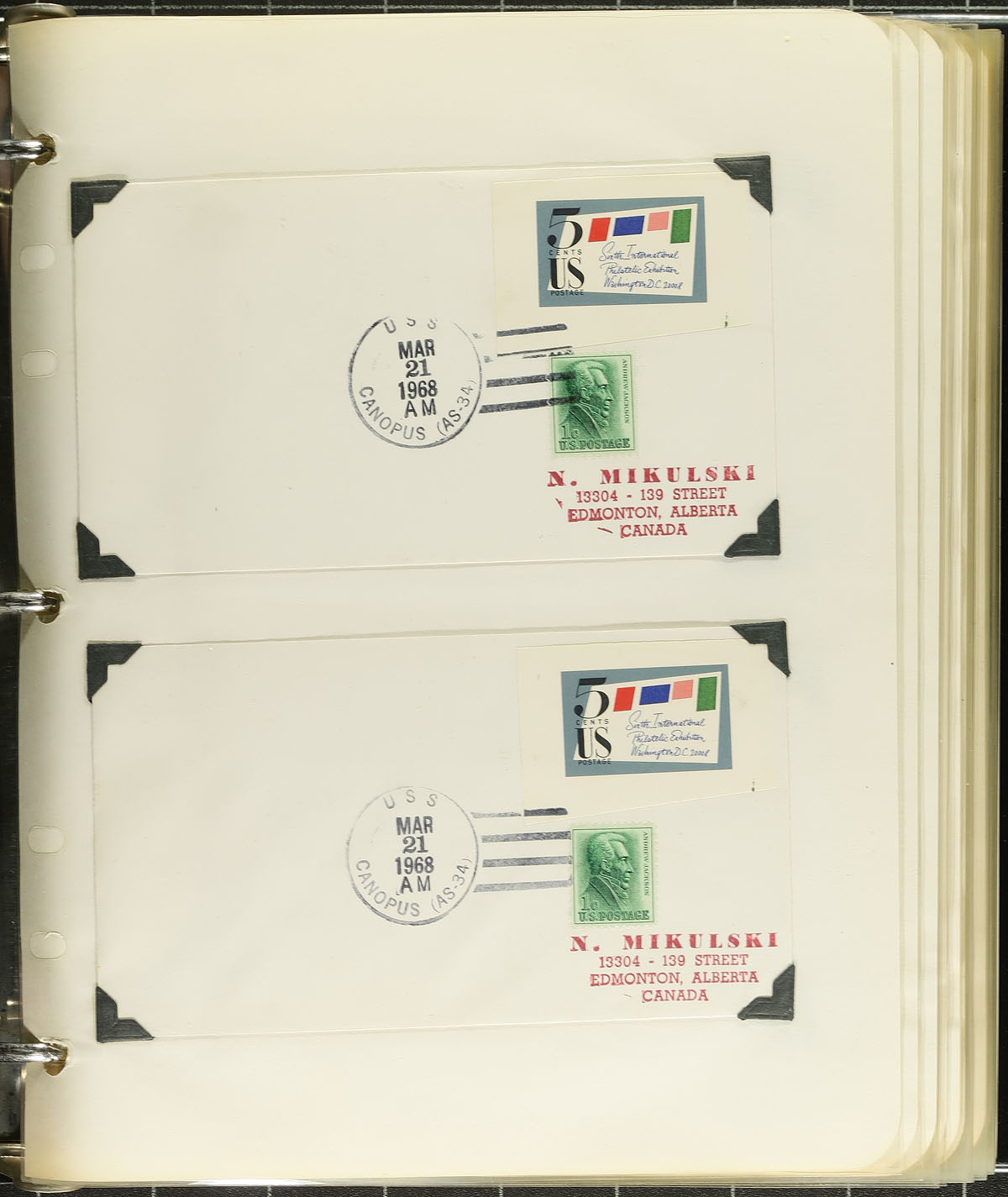 Four volume naval post office cancels on cover, mounted on pages and in page protectors. Created by a collector in Edmonton in 1968, who wrote every US naval ship that he thought might have a post office and created self-addressed envelopes. The return rate was quite high, and these covers have a combination of ship name, number and sometimes a rubber stamp or embossed cachet. Total of about 754 covers, most with two examples per ship (so over 350 different ships are here). A labour of love, with significant effort to assemble this. Estimate =