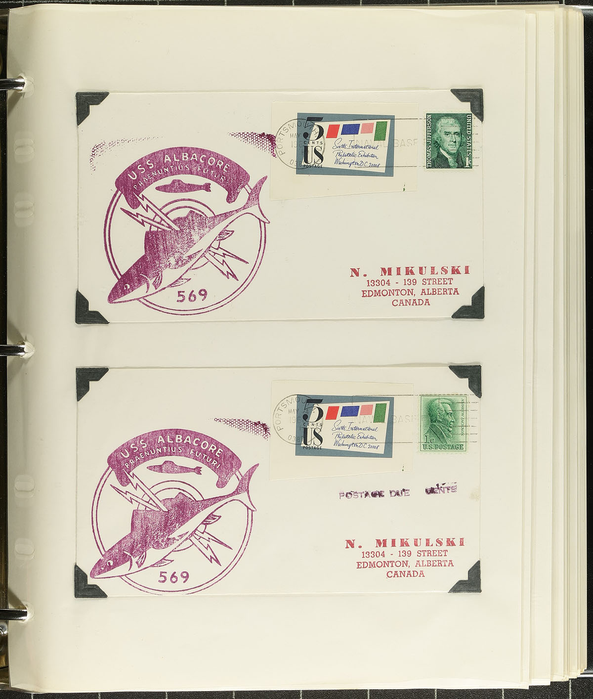 Four volume naval post office cancels on cover, mounted on pages and in page protectors. Created by a collector in Edmonton in 1968, who wrote every US naval ship that he thought might have a post office and created self-addressed envelopes. The return rate was quite high, and these covers have a combination of ship name, number and sometimes a rubber stamp or embossed cachet. Total of about 754 covers, most with two examples per ship (so over 350 different ships are here). A labour of love, with significant effort to assemble this. Estimate =