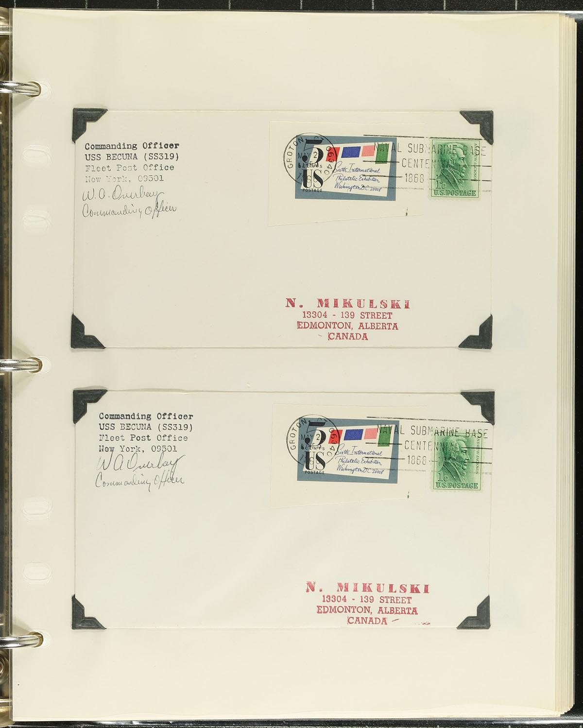 Four volume naval post office cancels on cover, mounted on pages and in page protectors. Created by a collector in Edmonton in 1968, who wrote every US naval ship that he thought might have a post office and created self-addressed envelopes. The return rate was quite high, and these covers have a combination of ship name, number and sometimes a rubber stamp or embossed cachet. Total of about 754 covers, most with two examples per ship (so over 350 different ships are here). A labour of love, with significant effort to assemble this. Estimate =