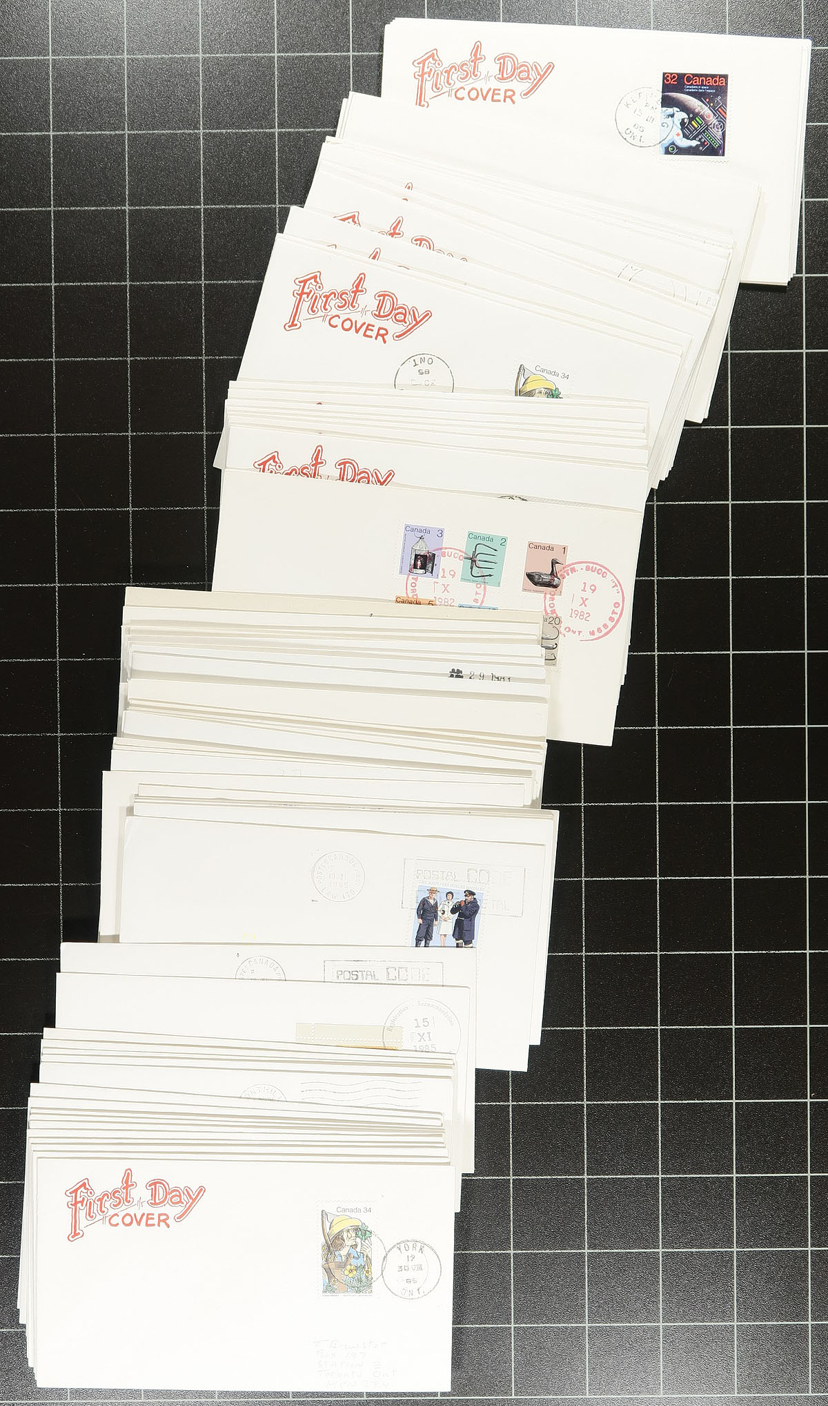Ontario Postmarks / First Day Covers. Many hundreds of Canada first day covers, primarily from the 1980's to the 1990's, collected for Ontario postmarks, containing a few hundred different towns, noting CDS, duplex, MOON, POCON, and more. A few covers have private cachets, but primarily uncacheted first day covers. Nice addition to any collection. Estimate =