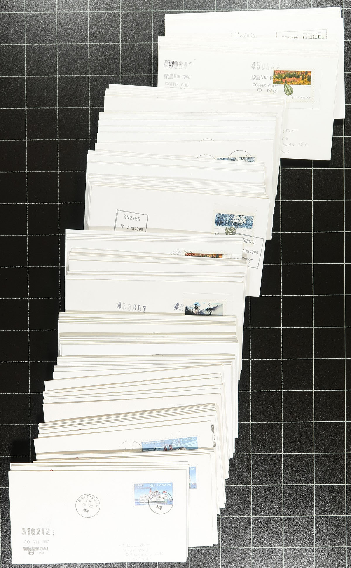 Ontario Postmarks / First Day Covers. Many hundreds of Canada first day covers, primarily from the 1980's to the 1990's, collected for Ontario postmarks, containing a few hundred different towns, noting CDS, duplex, MOON, POCON, and more. A few covers have private cachets, but primarily uncacheted first day covers. Nice addition to any collection. Estimate =
