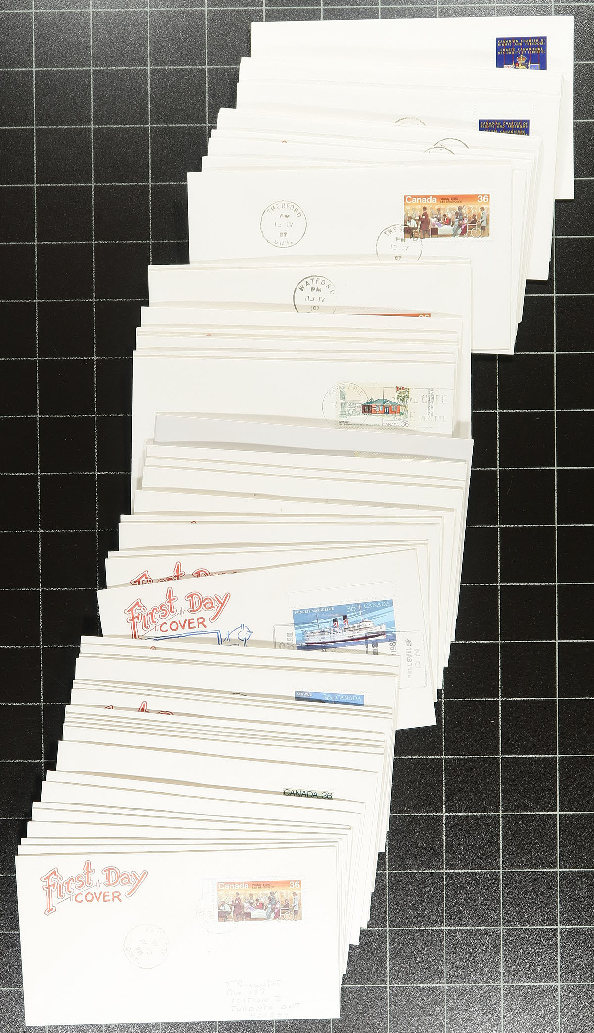 Ontario Postmarks / First Day Covers. Many hundreds of Canada first day covers, primarily from the 1980's to the 1990's, collected for Ontario postmarks, containing a few hundred different towns, noting CDS, duplex, MOON, POCON, and more. A few covers have private cachets, but primarily uncacheted first day covers. Nice addition to any collection. Estimate =
