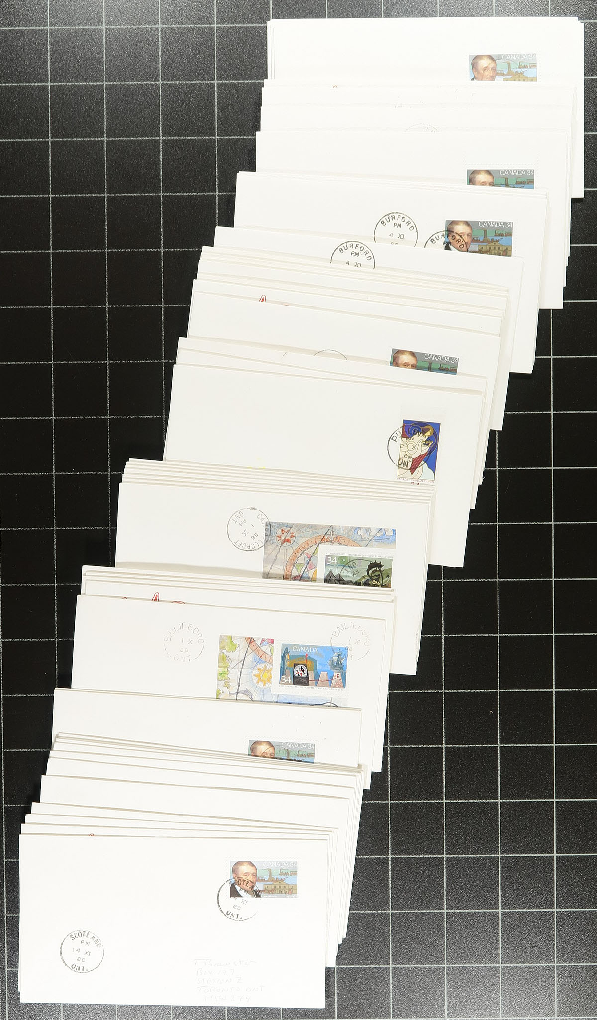 Ontario Postmarks / First Day Covers. Many hundreds of Canada first day covers, primarily from the 1980's to the 1990's, collected for Ontario postmarks, containing a few hundred different towns, noting CDS, duplex, MOON, POCON, and more. A few covers have private cachets, but primarily uncacheted first day covers. Nice addition to any collection. Estimate =