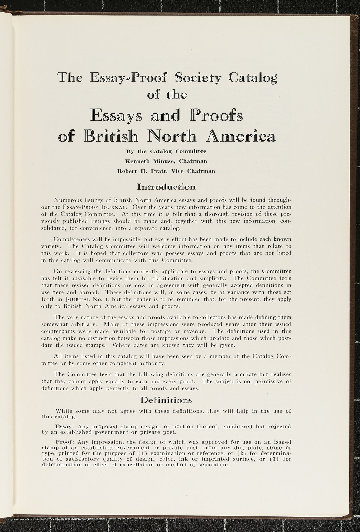 "The Essays and Proofs of British North America" by Minuse and Pratt, 1970 First Edition. The invaluable 198 page, hardcover definitive work on the early Essays and Proofs of Canada. Wonderfully illustrated with a wealth of knowledge. Overall condition is good, with a previous owners label on the inside (and pencil price of $195.00 from when this was bought decades ago). Estimate =