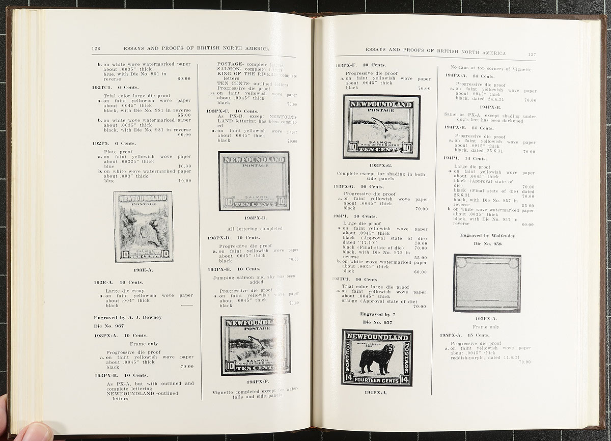 "The Essays and Proofs of British North America" by Minuse and Pratt, 1970 First Edition. The invaluable 198 page, hardcover definitive work on the early Essays and Proofs of Canada. Wonderfully illustrated with a wealth of knowledge. Overall condition is good, with a previous owners label on the inside (and pencil price of $195.00 from when this was bought decades ago). Estimate =