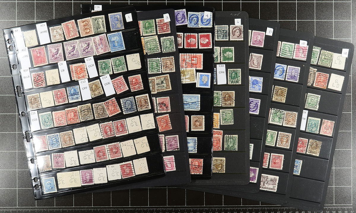 Collector's Holding Part 1. Insignia A5-G22, group of 676 stamps, of which 638 are different to either stamp or perfin position, from 37 different perfin insignias. Neatly arranged on 13 pages and identified by The Perfin Handbook by the previous owner. This section represents the CNR / CPR Railways, but the owner notes that ½ of the insignia designes are RF E and RF F (19). A great "foot in the door" to this fascinating collecting area, see subsequent lot for Part #2. Owner's Estimate =