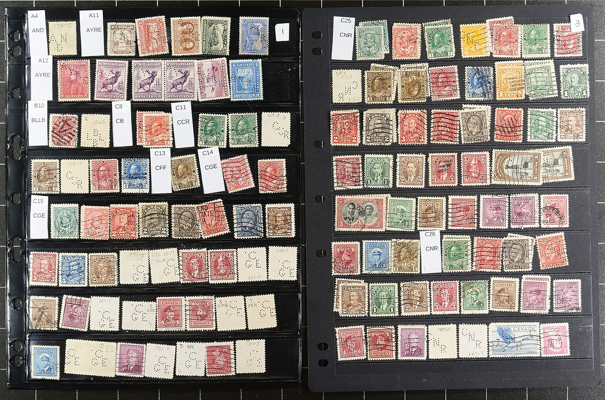 Collector's Holding Part 1. Insignia A5-G22, group of 676 stamps, of which 638 are different to either stamp or perfin position, from 37 different perfin insignias. Neatly arranged on 13 pages and identified by The Perfin Handbook by the previous owner. This section represents the CNR / CPR Railways, but the owner notes that ½ of the insignia designes are RF E and RF F (19). A great "foot in the door" to this fascinating collecting area, see subsequent lot for Part #2. Owner's Estimate =