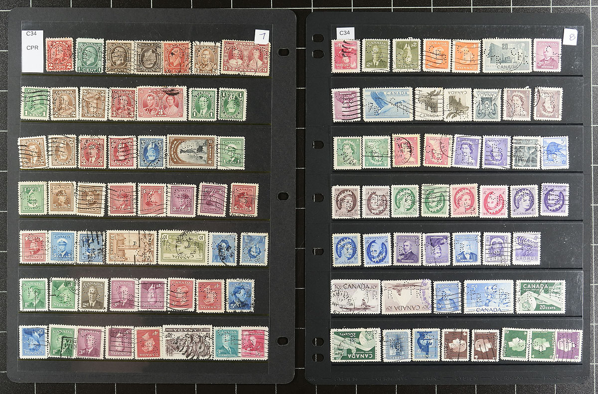 Collector's Holding Part 1. Insignia A5-G22, group of 676 stamps, of which 638 are different to either stamp or perfin position, from 37 different perfin insignias. Neatly arranged on 13 pages and identified by The Perfin Handbook by the previous owner. This section represents the CNR / CPR Railways, but the owner notes that ½ of the insignia designes are RF E and RF F (19). A great "foot in the door" to this fascinating collecting area, see subsequent lot for Part #2. Owner's Estimate =