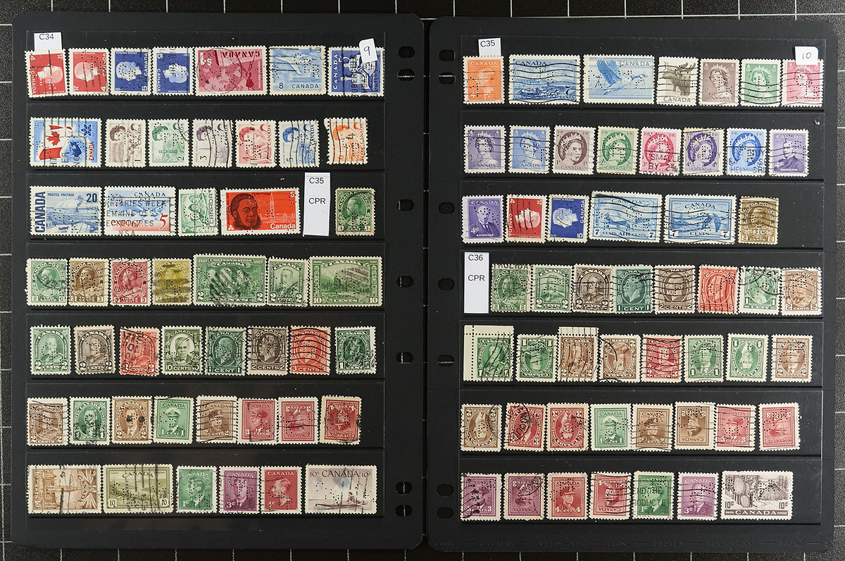 Collector's Holding Part 1. Insignia A5-G22, group of 676 stamps, of which 638 are different to either stamp or perfin position, from 37 different perfin insignias. Neatly arranged on 13 pages and identified by The Perfin Handbook by the previous owner. This section represents the CNR / CPR Railways, but the owner notes that ½ of the insignia designes are RF E and RF F (19). A great "foot in the door" to this fascinating collecting area, see subsequent lot for Part #2. Owner's Estimate =