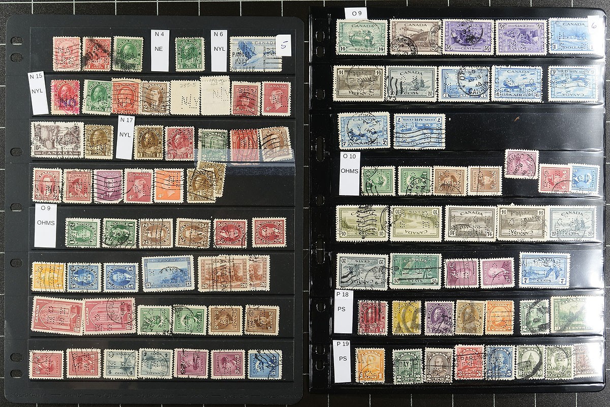 Collector's Holding Part 2. Insignia I10-W18 and Gutta Percha, selection of 592 stamps, of which 551 are different to either stamp or perfin position, from 54 different Insignia. All arranged on 12 pages and identified by The Perfin Handbook by the previous owner. Owner notes that the O9 and O10 catalogue $143.00 alone (2024 Unitrade) and that half of the Insignia are RF E and RF F (29). Combined with the previous lot, this would give someone a great entry into this collecting area, or fun for the seasoned perfin collector to compare against their own holdings. Estimate =