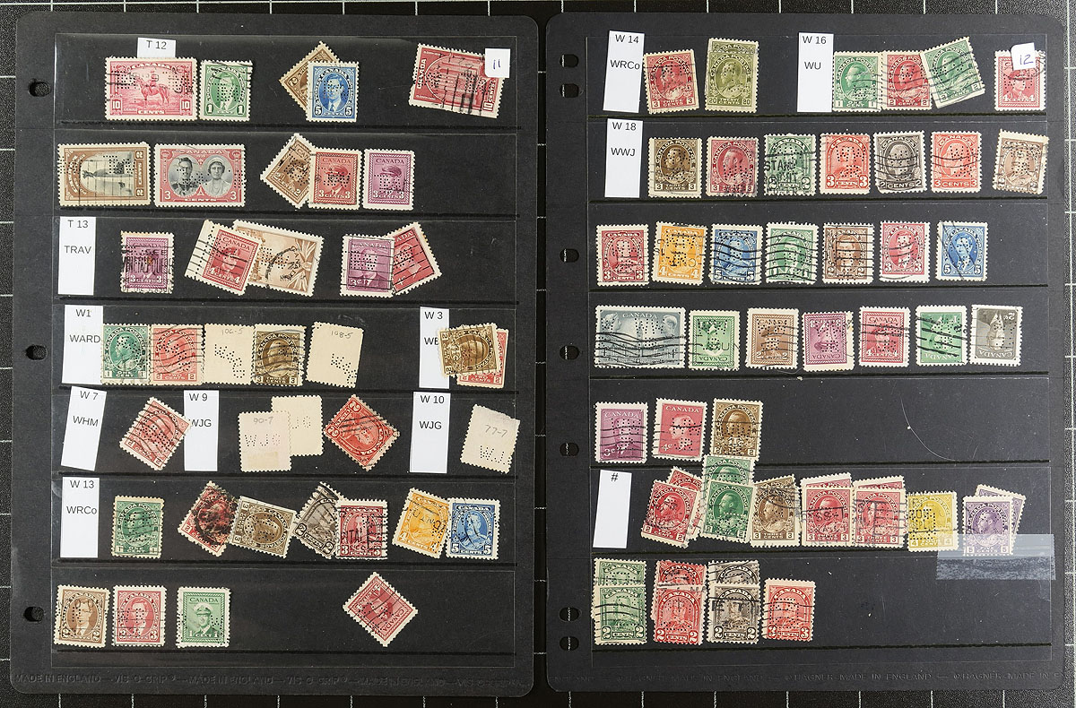 Collector's Holding Part 2. Insignia I10-W18 and Gutta Percha, selection of 592 stamps, of which 551 are different to either stamp or perfin position, from 54 different Insignia. All arranged on 12 pages and identified by The Perfin Handbook by the previous owner. Owner notes that the O9 and O10 catalogue $143.00 alone (2024 Unitrade) and that half of the Insignia are RF E and RF F (29). Combined with the previous lot, this would give someone a great entry into this collecting area, or fun for the seasoned perfin collector to compare against their own holdings. Estimate =